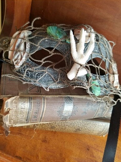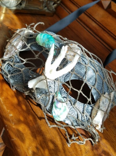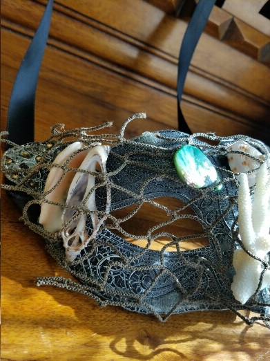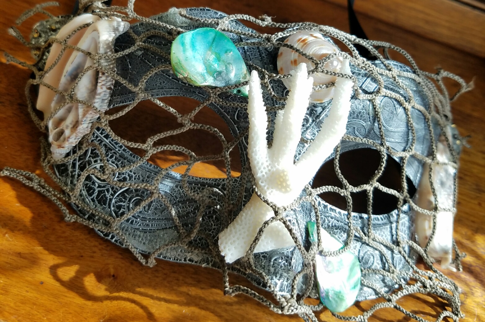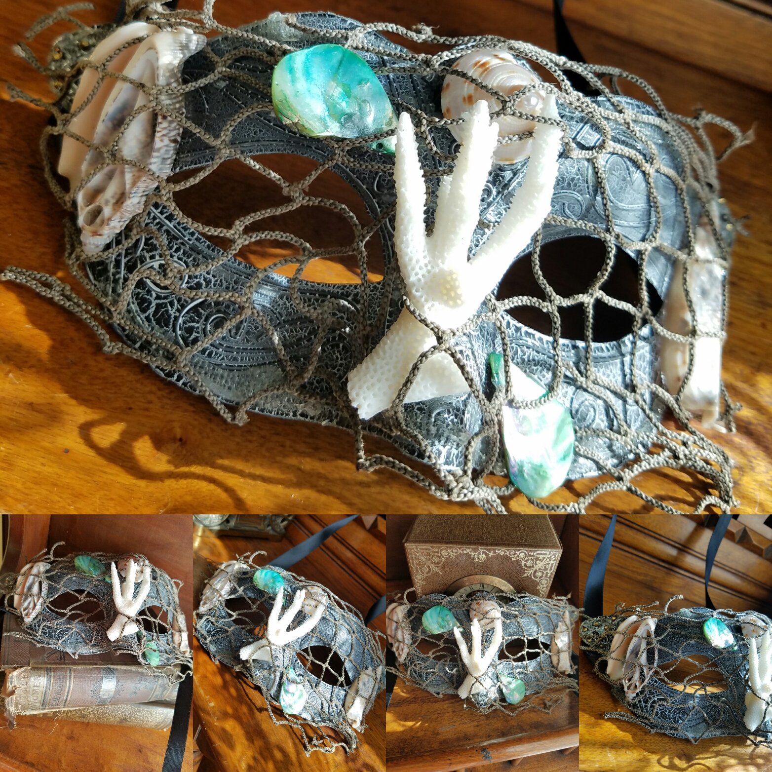 Black Swirl Mask -Coral -Seashells -Fishing net -Green shell pieces -Brown/gold rhinestones