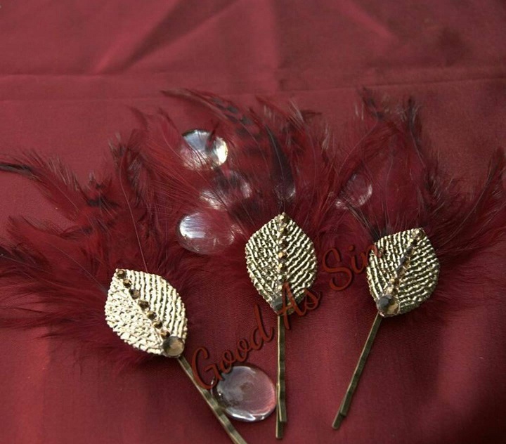 Filigree bobby pin -Maroon rooster feathers -Gold plated leaf -Smoked topaz crystals