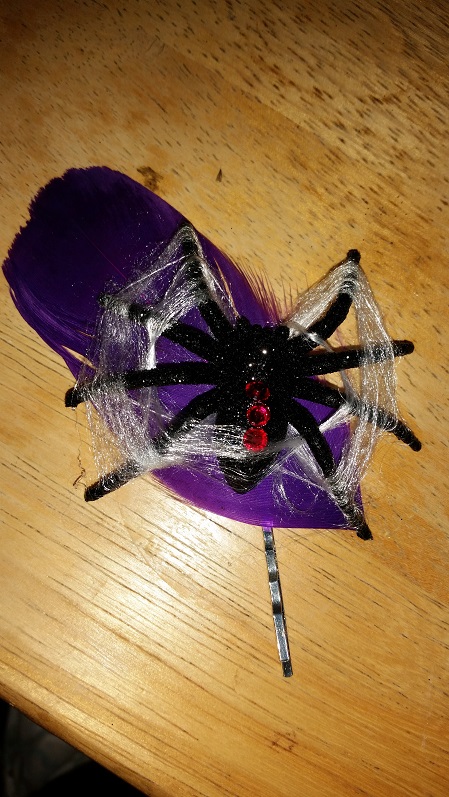 1 Black sparkly spider - 3 purple rhinestones - 1 purple feather - webbing - 1 bobby pin