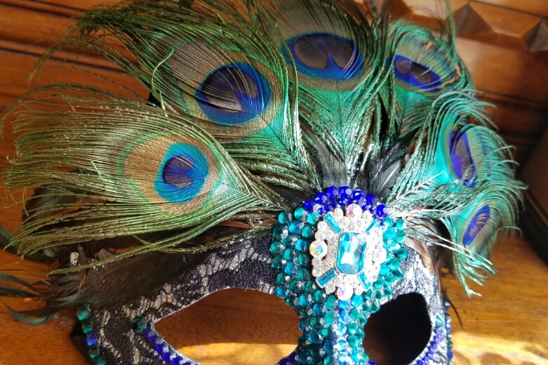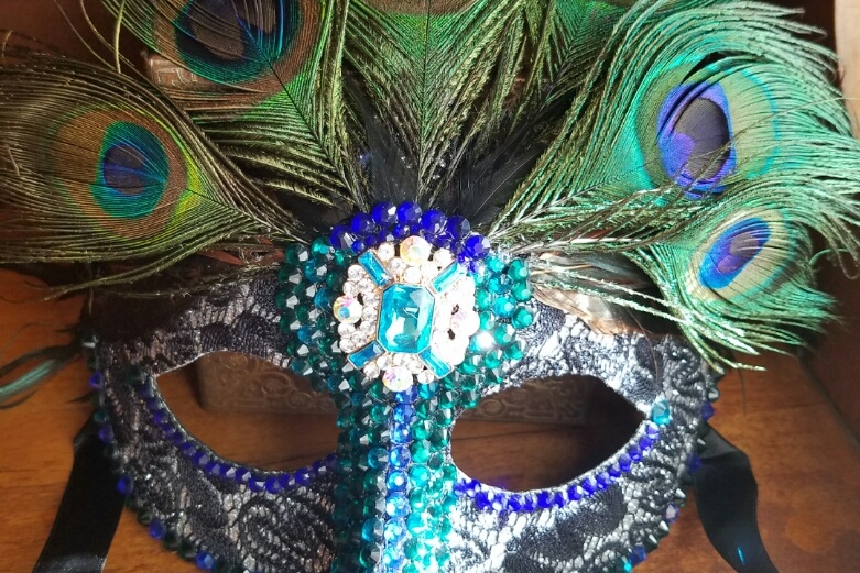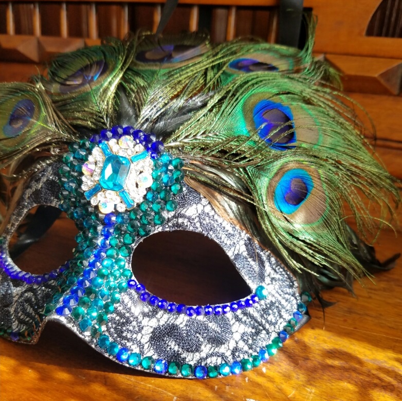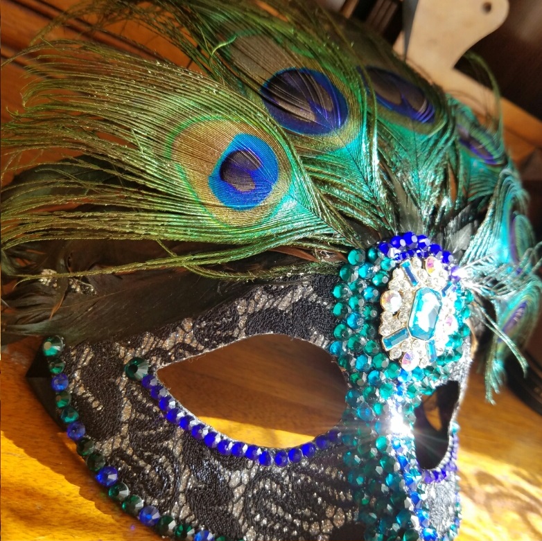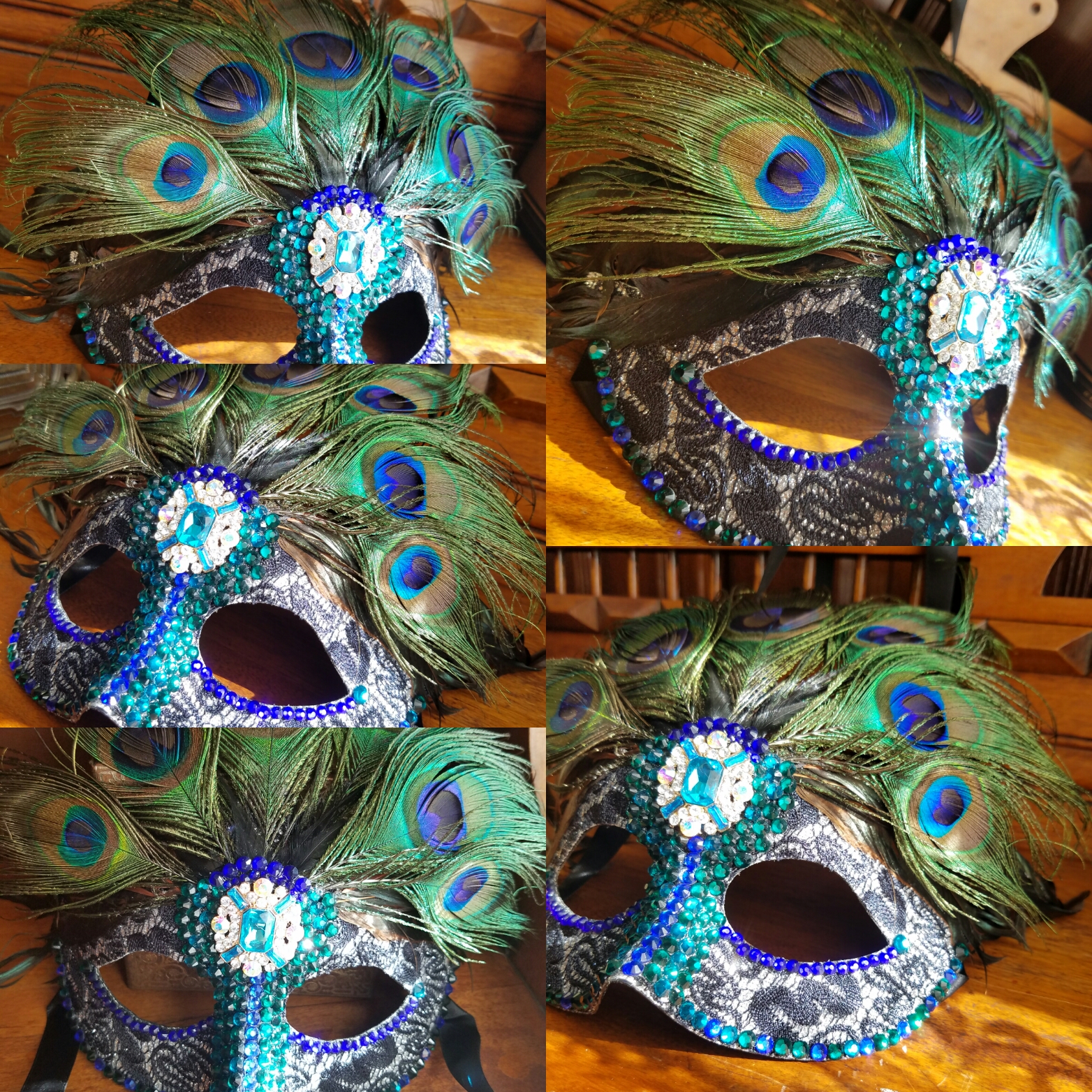 Black Mask -Peacock feathers -Emerald crystals -Cobalt crystals -Blue/clear pendant