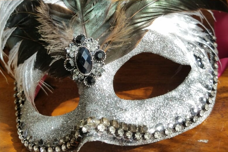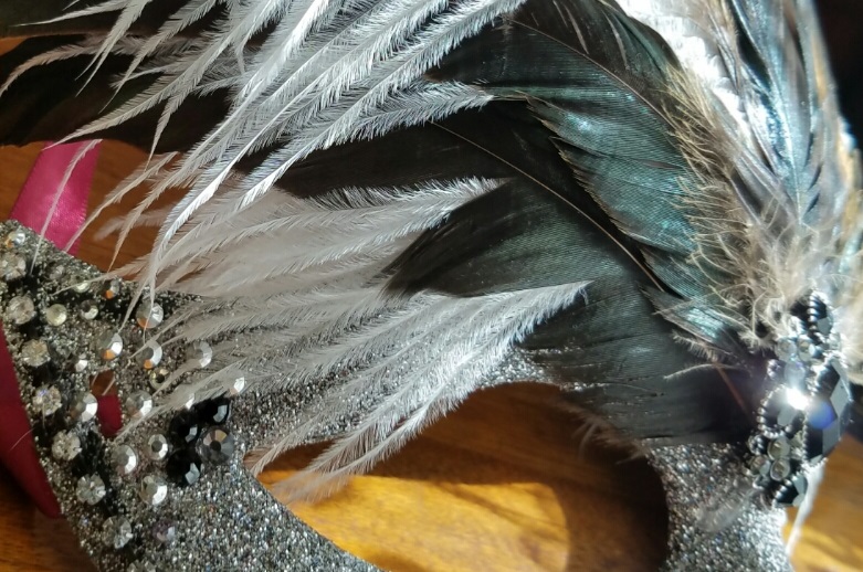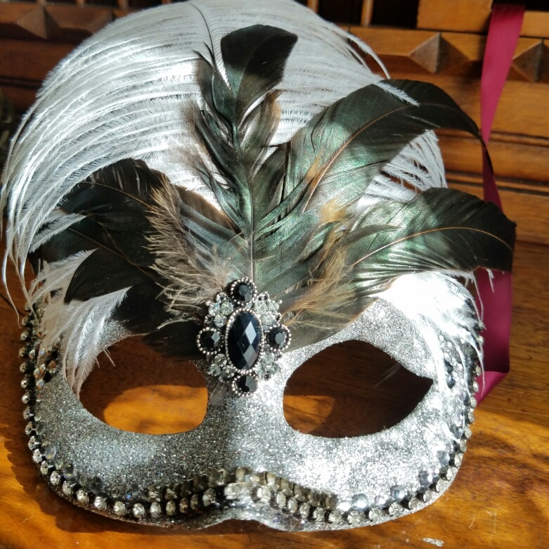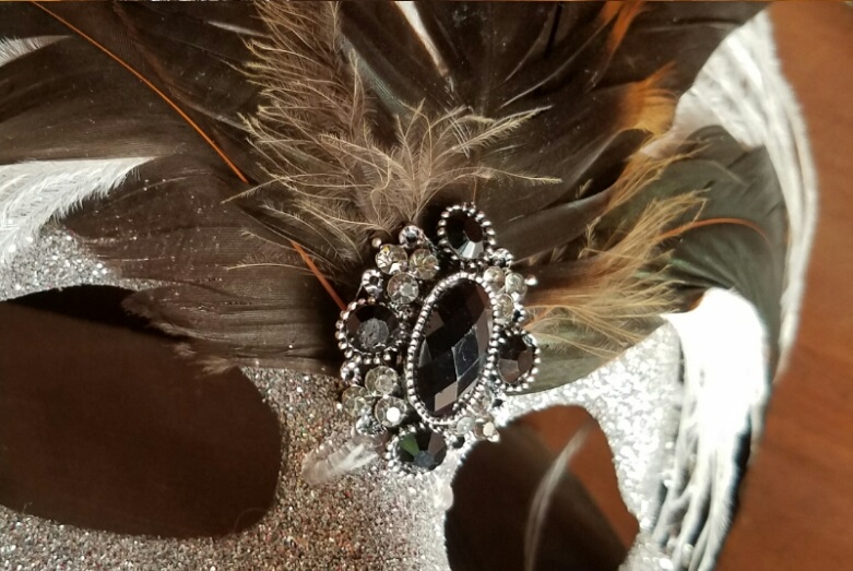 Silver Sparkle Mask -5 rooster tail feathers -1 large white ostrich feather -Black/clear rhinestone pendant -Clear/silver rhinestones