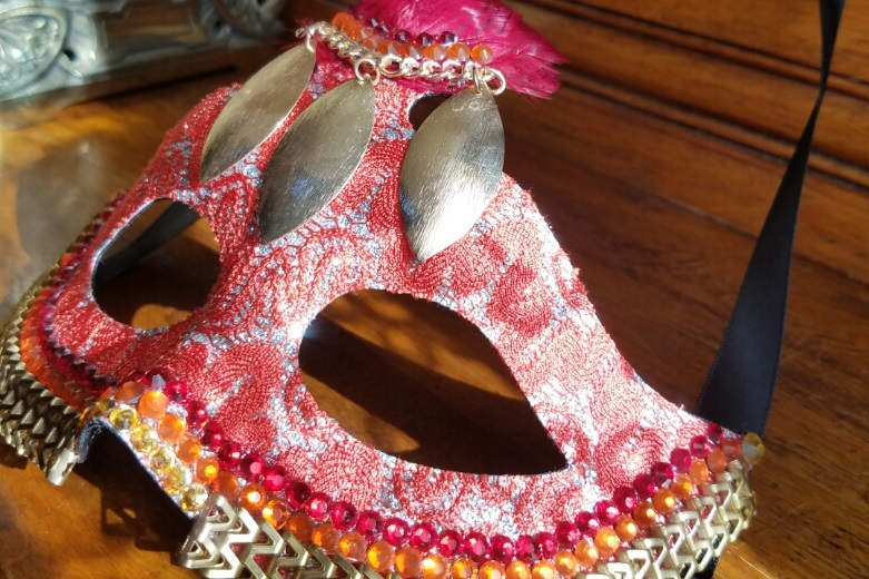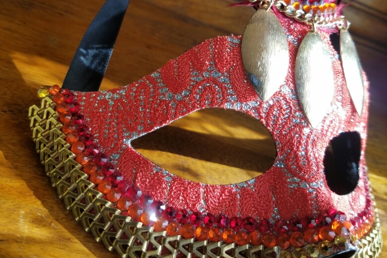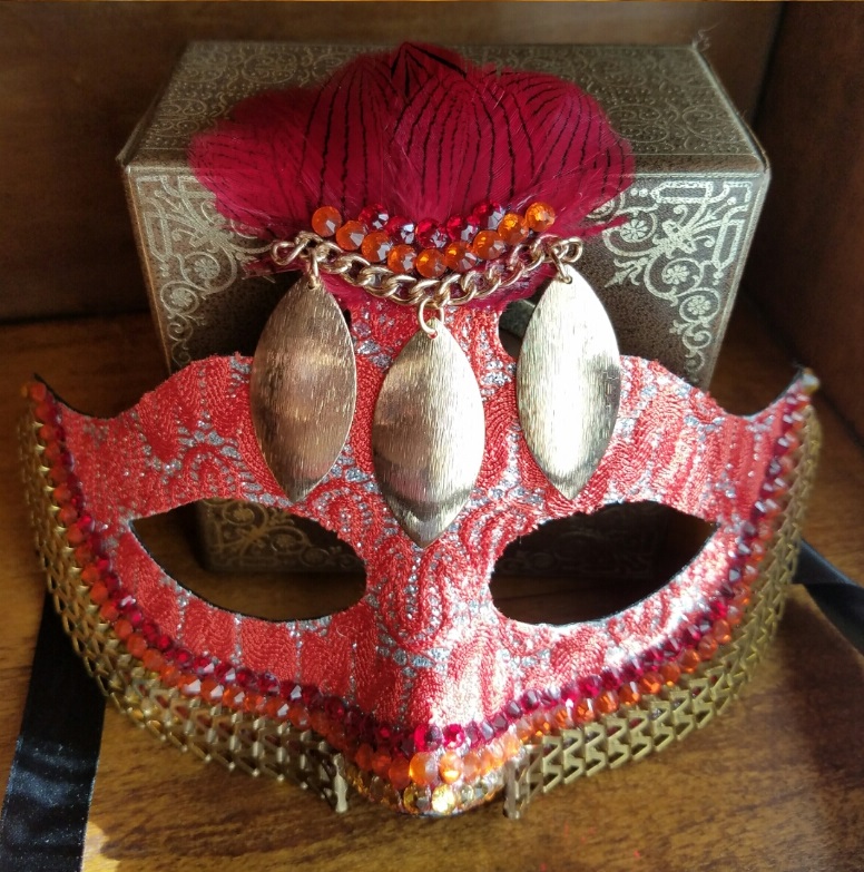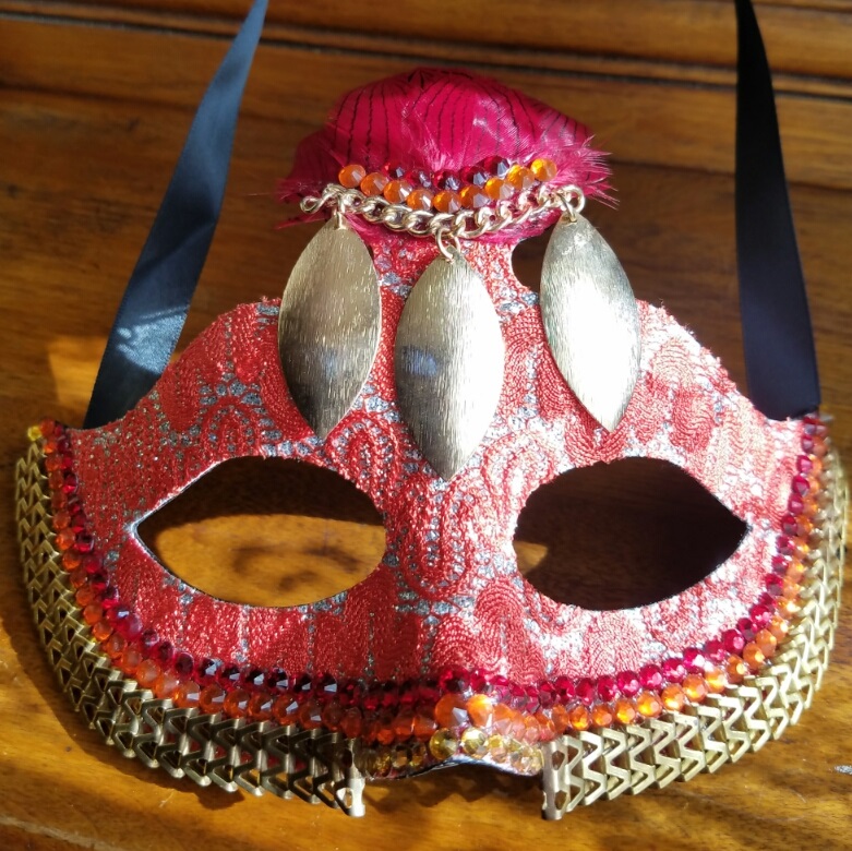 Red/Silver Sparkle Mask -Red guinea hen feathers -Gold chain -3 gold pendants -Red, orange, & yellow rhinestones