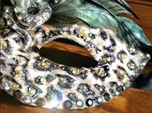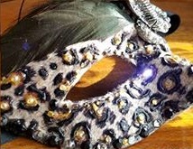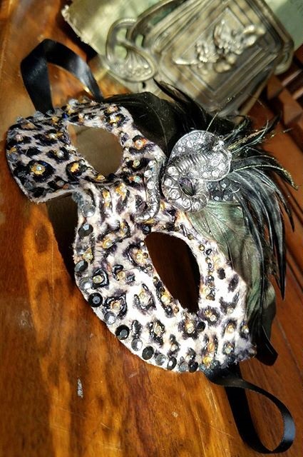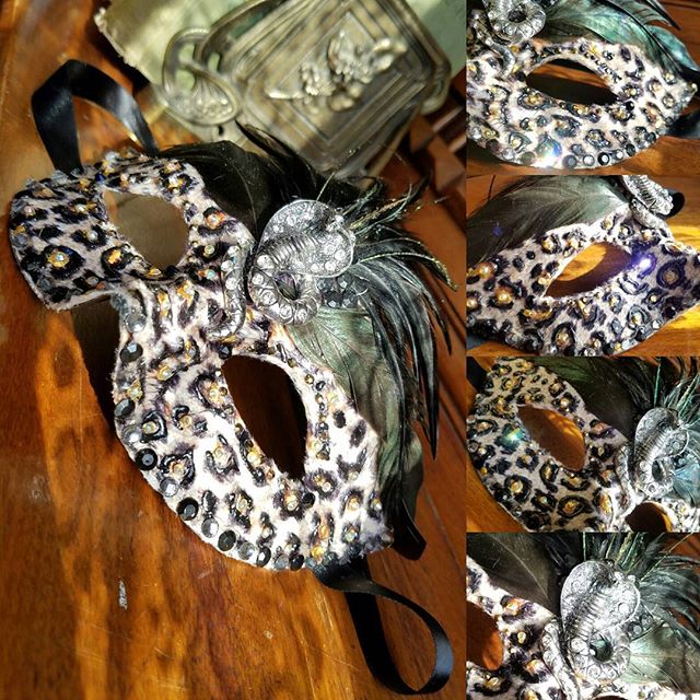 Leopard Mask -Rooster feathers -Peacock flue/herl feathers -Black crystals -Topaz crystals -Gold crystals -AB Gold crystals -Cobra pendant -Black/gold paint
