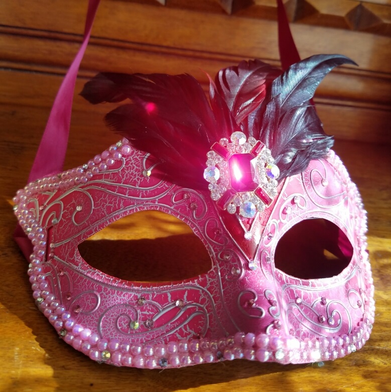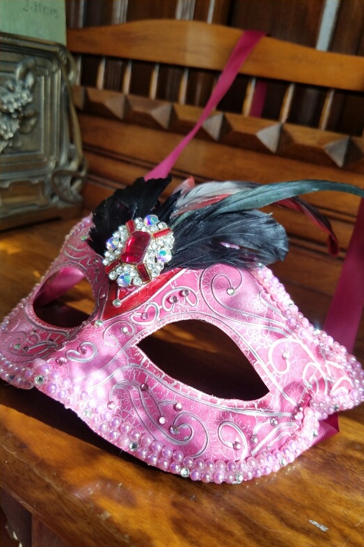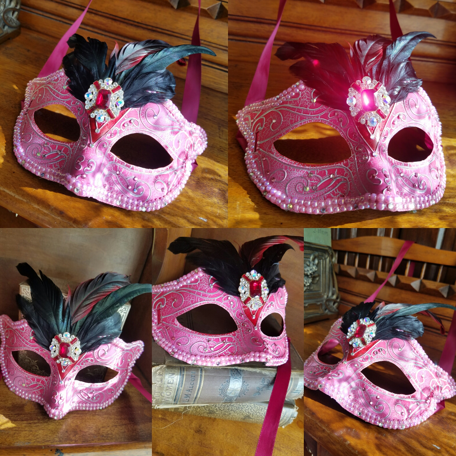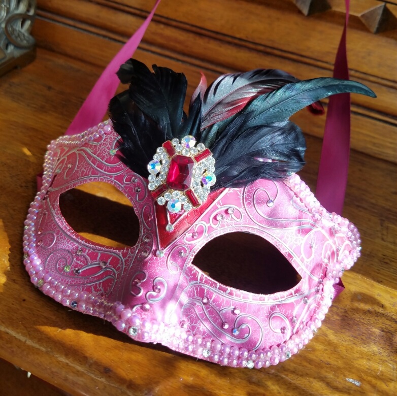 Handcrafted masquerade mask with a plastic base and raised features. Embellished with black/red rooster feathers, ballet pink flat back pearls, Preciosa crystals (crystal ab, pink, hot pink, fuschia). and a pink/clear pendant as the center piece. Mask ties are maroon satin ribbon.