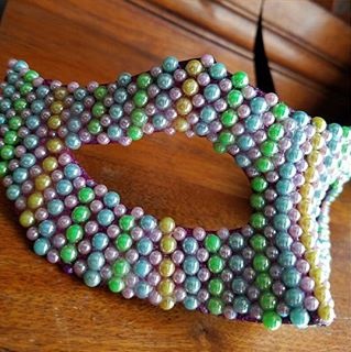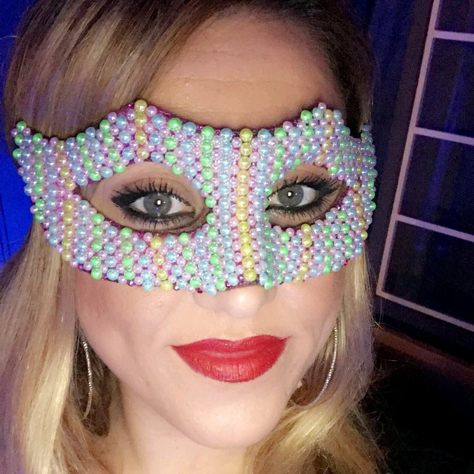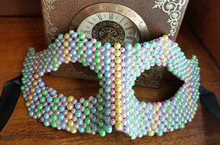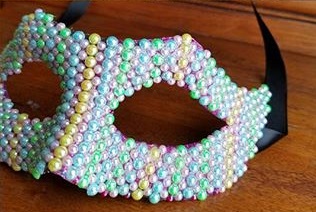 Handcrafted masquerade mask with a plastic glitter base. Embellished with rows of flat back pearls (pastel yellow, pastel blue, pale green, pastel pink). Mask ties are black satin ribbon.